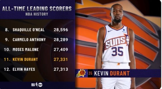 11月23日讯 昨日杜兰特砍下31分,在历史总得分榜上超越埃尔文-海耶斯升至11位。