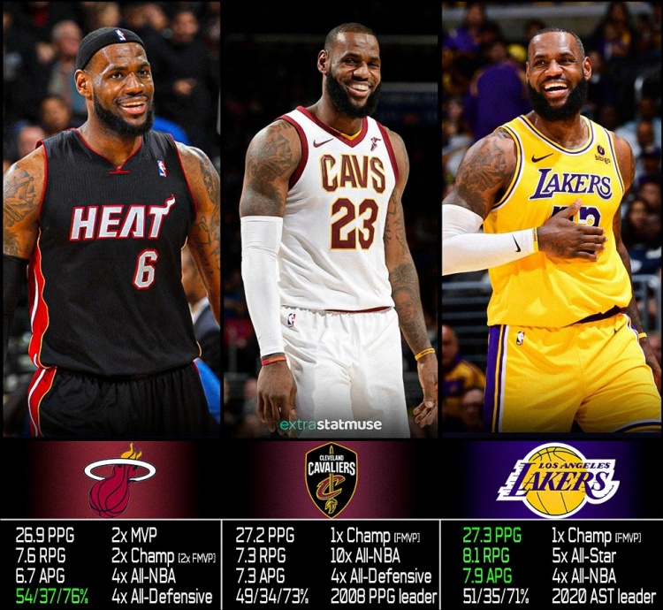 湖人时期的詹姆斯场均得到27.3分8.1篮板7.9助攻,均高于热火和骑士时期。热火时期詹姆斯的三项命中率最高。
