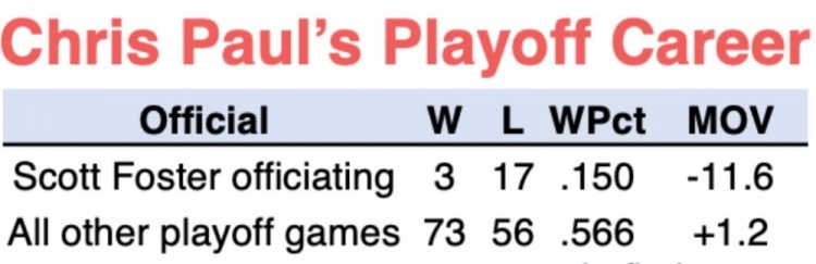 据统计,保罗生涯有20场季后赛福斯特是裁判,这20场保罗3胜17负,胜率为15%,球队场均输11.6分;而保罗生涯其余(福斯特不是裁判)季后赛比赛,保罗是73胜56负,胜率56.6%,球队场均赢1.2分。