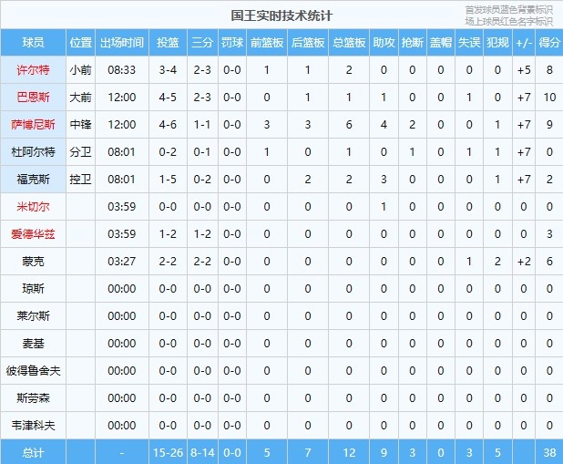 第一节,国王外线手感火热,全队三分合计14投8中,命中率高达57%,其中蒙克、巴恩斯、许尔特各自命中2记三分。