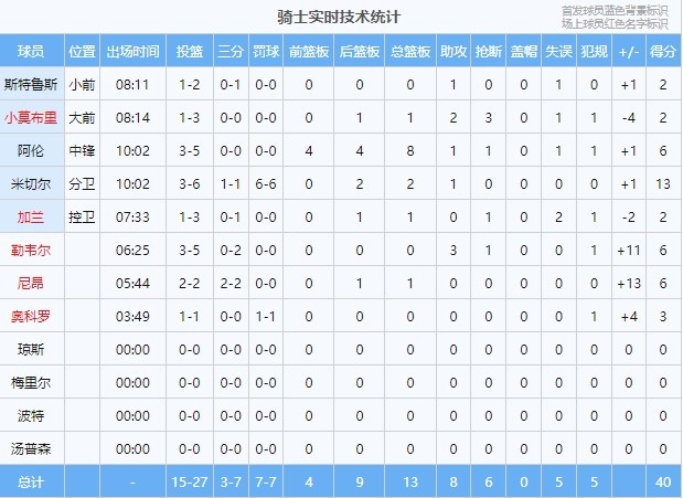 第一节,骑士火力全开,全队单节27投15中,三分7中3轰下40分,米切尔拿到13分。