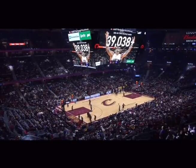 骑士赛前还为生涯得分超过39000分的勒布朗送上了致敬视频,全场欢呼。