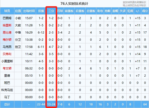 半场未结束 76人三分24中13已创球队本季半场新高 湖人三分8中1