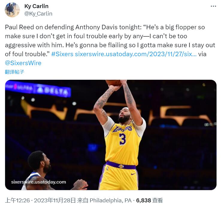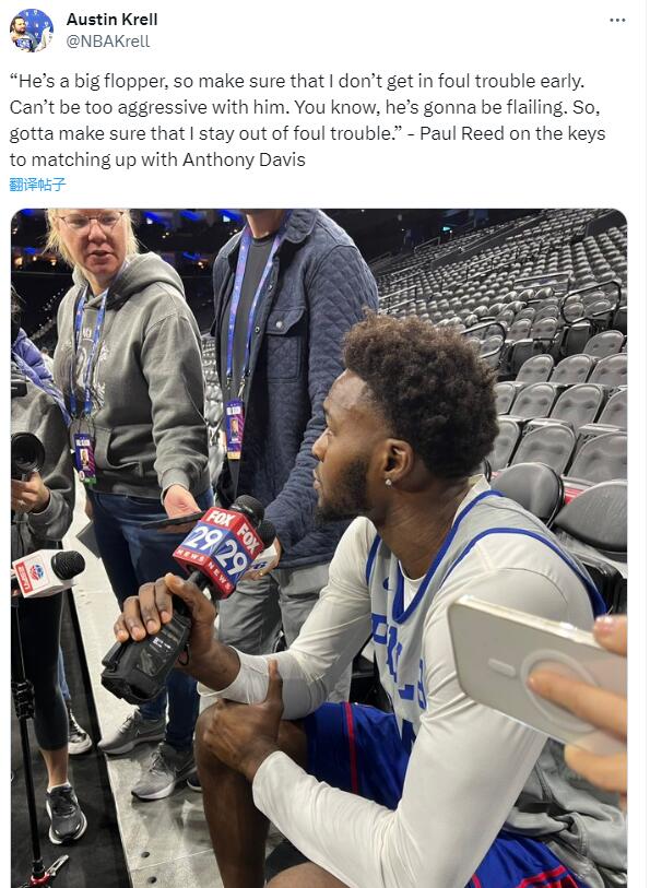 76人中锋里德:浓眉是大假摔犯 不能太有侵略性他会张牙舞爪