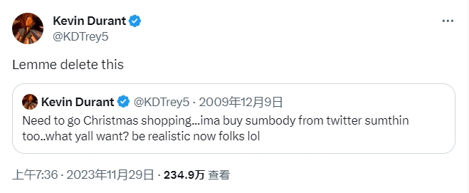 当时快到圣诞节了,杜兰特发推写道:“需要为了圣诞节去购物,我会为推特上的一些网友购买一些东西,你们想要什么?让我们现实点哈朋友们,哈哈哈。”
