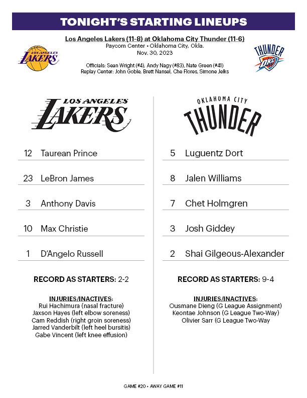 12月01日讯 上午9点,NBA常规赛,湖人对阵雷霆。赛前两队首发出炉:湖人:托里恩-普林斯、詹姆斯、安东尼-戴维斯、克里斯蒂、德安吉洛-拉塞尔;雷霆:多特、杰伦-威廉