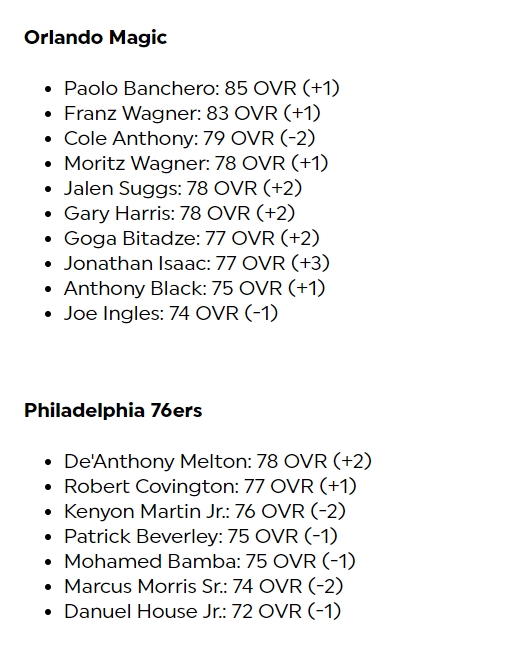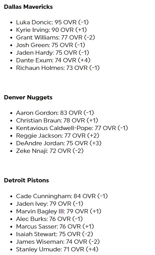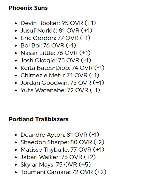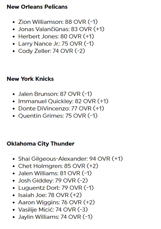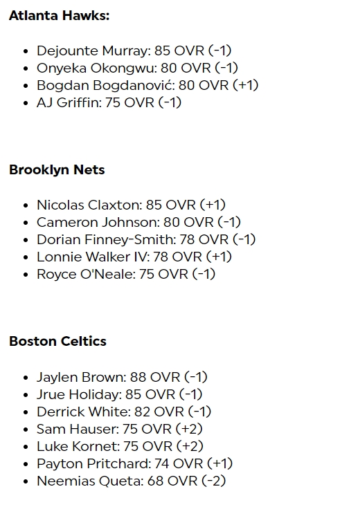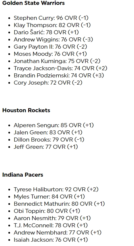 其中库里-1来到96,布克+1来到95,东契奇-1来到95,亚历山大+1来到94,哈利伯顿+2来到92,欧文+1来到90,文班亚马-1来到85、霍姆格伦+2来到85,莱昂纳德-2来到90,哈登-3来到86。
