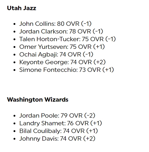 其他一些值得关注的球员能力值变化——巴特勒93(-1)、浓眉92(-1)、米切尔92(-1),福克斯89(+1)、锡安88(-1)、杰伦-布朗88(-1)、乔治88(-1)、拉梅洛-鲍尔87(+2)、申京85(+1)、克莱82(-1)、威少80(-1)普尔79(-2)、维金斯76(-3)、哈克斯77(+5)、小乔丹75(+3)。