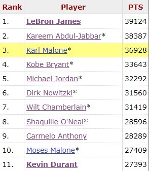 见证伟大!KD只需得17分便可超越摩西-马龙跻身历史得分榜Top10