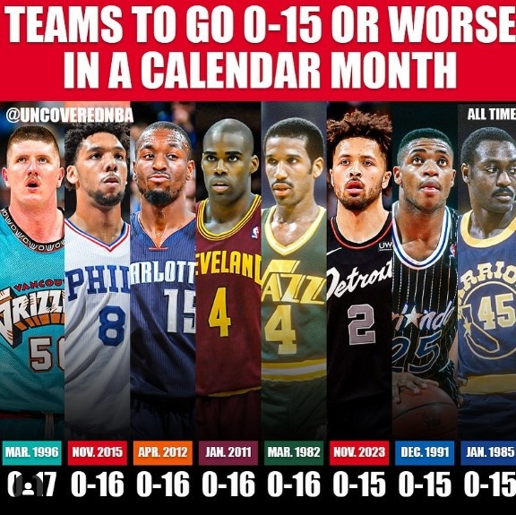 单月0胜15负或更糟糕战绩球队:本赛季活塞 15年76人等队在列