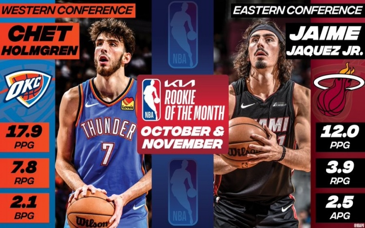 12月5日讯 今日NBA官方公布了10-11月最佳新秀得主,热火18号秀小海梅-哈克斯与雷霆球员霍姆格伦分别当选。霍姆格伦在此期间场均可以得到17.9分7.8篮板2.1盖
