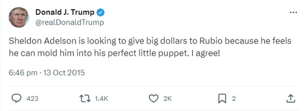 等到2016年,谢尔登一开始支持的是极右翼候选人,佛罗里达州参议员马科-卢比奥。而特朗普公开在推特上嘲讽道:“(谢尔登)以为能把他塑造成完美的小木偶,我同意!”