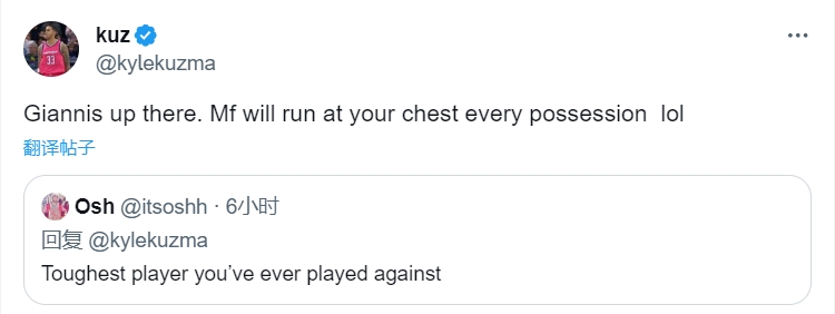 12月06日讯 奇才球员库兹马在推特进行Q&A,有球迷问道最难对付的球员。“就是扬尼斯!那MF每回合都狠狠顶你胸哈哈。”库兹马回复道。