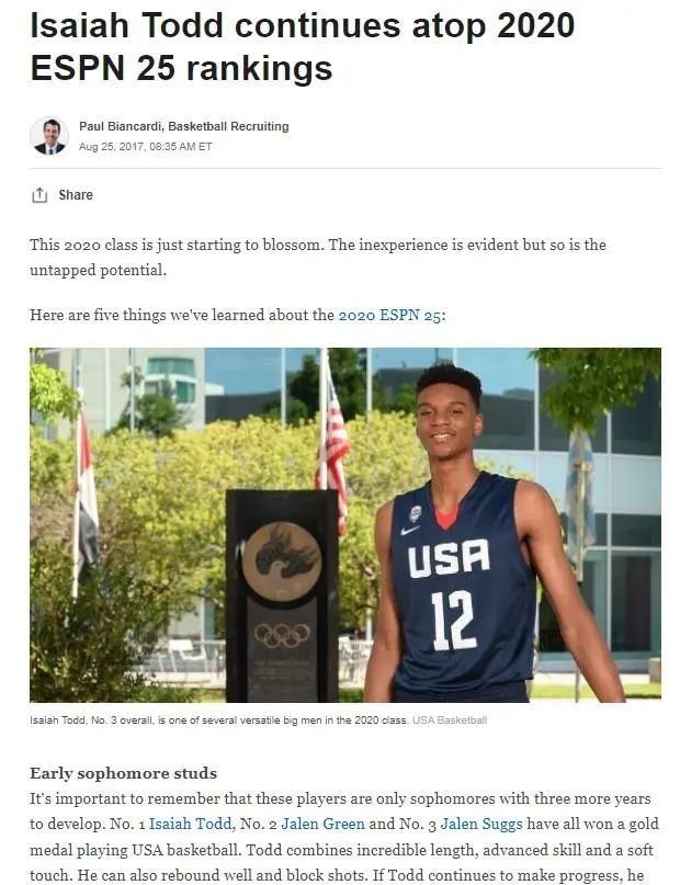 曾经的托德也是响当当的一号人物:高二那年曾经一度被ESPN评为2020届第一位,最终拒绝了堪萨斯、肯塔基和北卡这些豪门,承诺加入密歇根大学。结果半年之后变了卦,放了密歇根的鸽子,加入到了发展联盟的点燃队。