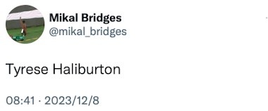 赛后篮网球星米卡尔-布里奇斯发推写道:“泰瑞斯-哈利伯顿。”