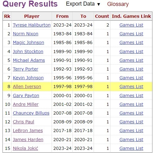 哈利伯顿3次至少25分15助+0失误 历史唯一&其他没有人超过1次