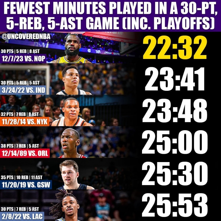 史上砍30分5板5助最快球员:詹姆斯22分32秒居首 乔丹25分钟第4
