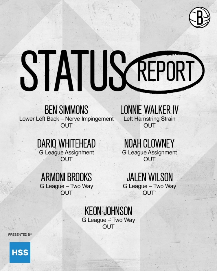 12月8日讯 今日,NBA常规赛,篮网将在北京时间8:30对阵奇才。篮网官方更新社媒,发布本场比赛的伤病报告。具体缺席情况如下:1.本-西蒙斯(左背部神经压迫);2.朗尼-沃