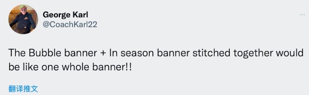 前掘金主帅乔治-卡尔对此发推写道:“把园区冠军旗帜和季中赛冠军旗帜缝一起,这样就像是一面完整的旗帜了。”