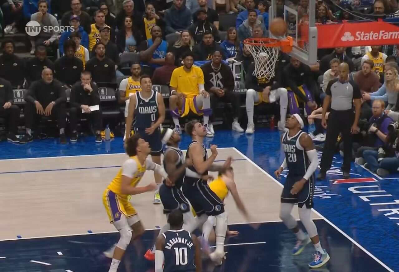 崴脚了!东契奇落地踩到里夫斯脚上不慎扭脚 休息会儿后回到比赛