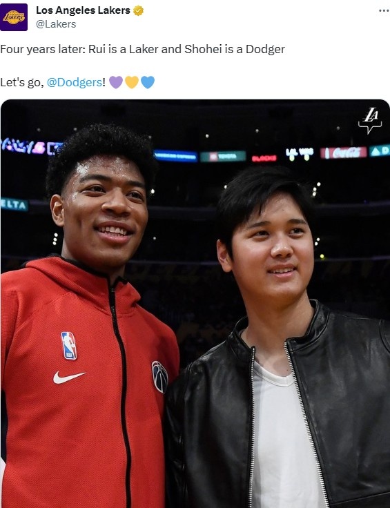 湖人官推晒旧照蹭7亿热度:4年后八村是湖人一员 大谷是道奇一员