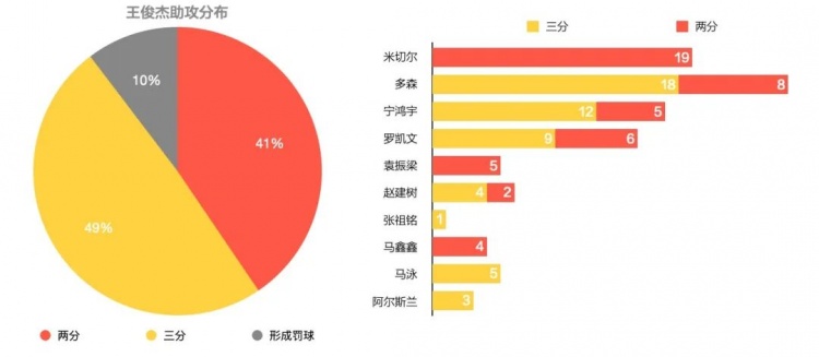 这一点体现在数据上,就是王俊杰的三分助攻比例高的惊人,目前他总计116次助攻中,三分助攻达到49%,而他的两分助攻中,有近一半都喂给了大外援米切尔,其他人寥寥无几(换句话说吃饼吃不下)