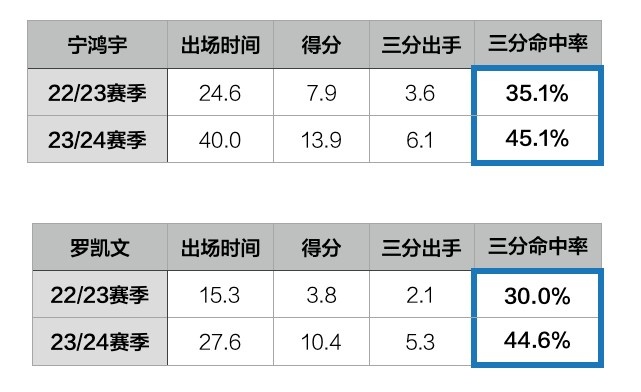本赛季宁波国内球员中,宁鸿宇和罗凯文是最受王俊杰滋润的球员,上赛季没有王俊杰发牌的宁鸿宇三分球命中率只有35.1%,本赛季却直接暴涨至45.1%的水平。和王俊杰一起来到宁波队的罗凯文也一样,上赛季在北控三分命中率只有30%的他,本赛季也猛升至44.6%(当然这两位球员本身也练的很努力)。