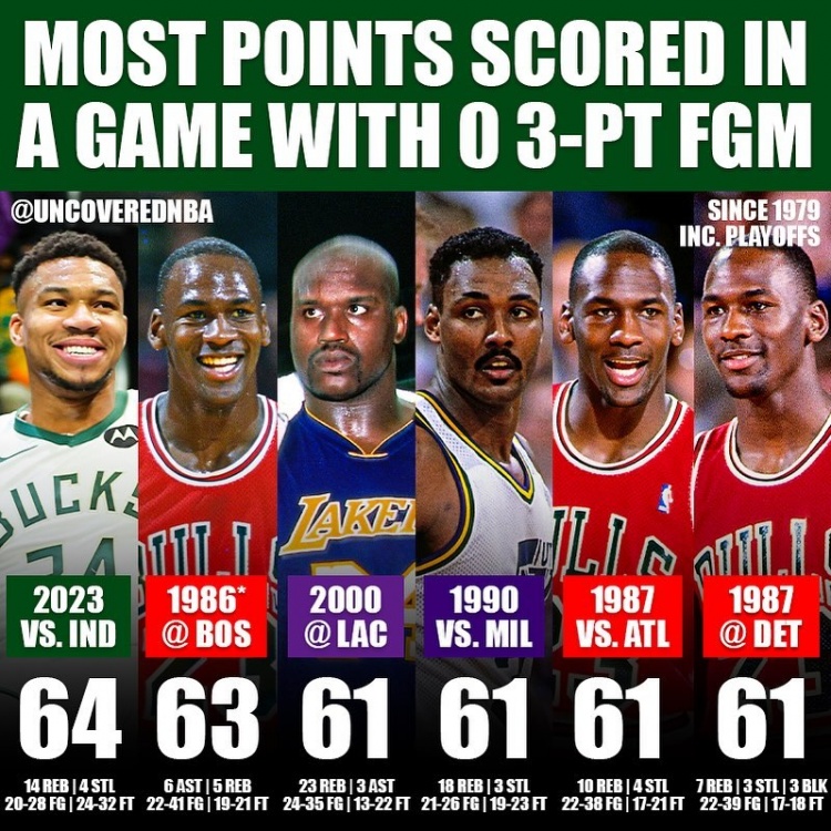 史上单场无三分命中得分排行:字母哥64分居首 乔丹多次砍60+