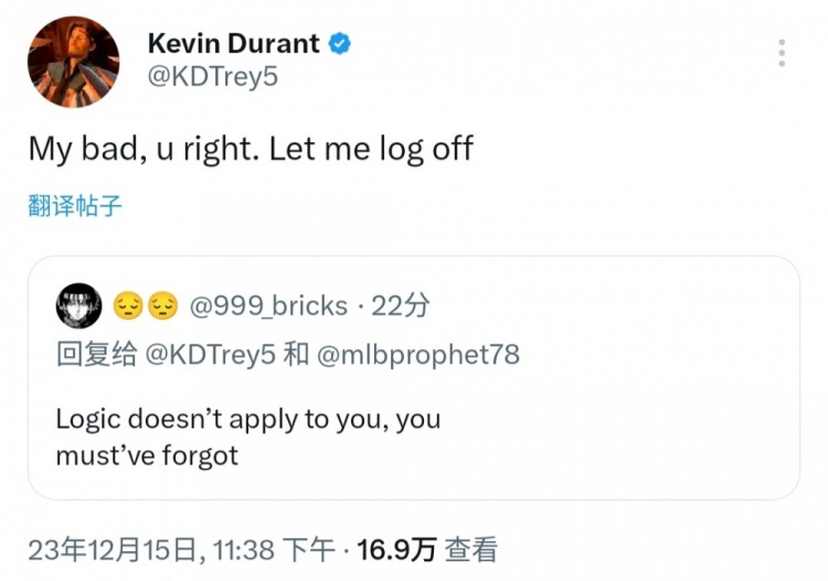 对此,杜兰特回复到:我错了,你说得对,现在我去注销账号了。