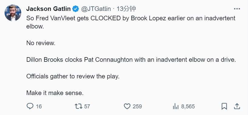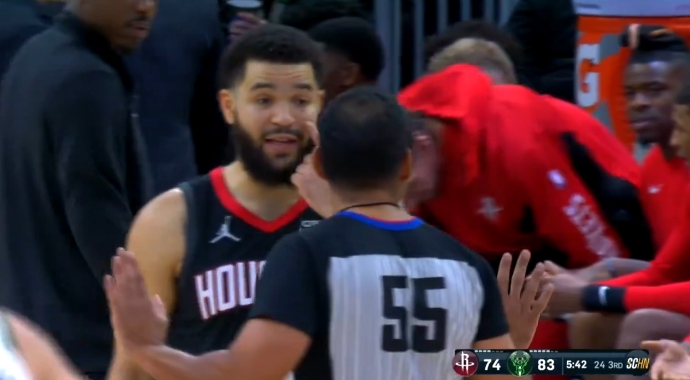 上半场范弗里特被大洛肘到面部,当时裁判没有申请回看录像。而狄龙肘到康诺顿面部,裁判则是申请了回看录像,范弗里特以及火箭记者们对此均很不满!