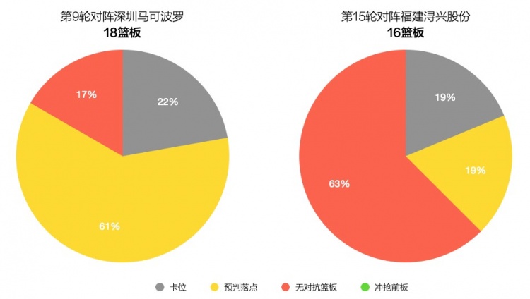第一阶段第9轮对阵深圳的比赛,阿不都沙拉木拿到了赛季至今最高的19个篮板(严格来说应该是18个篮板球,因为有一球其实是盖帽,但技术台统计成了防守篮板)。而我们手动统计了阿不都沙拉木拿到这18个篮板球的方式,其中只有4个是利用卡位技术保护下来的,其余的基本上都是通过预判球的落点或者无对抗的篮板。