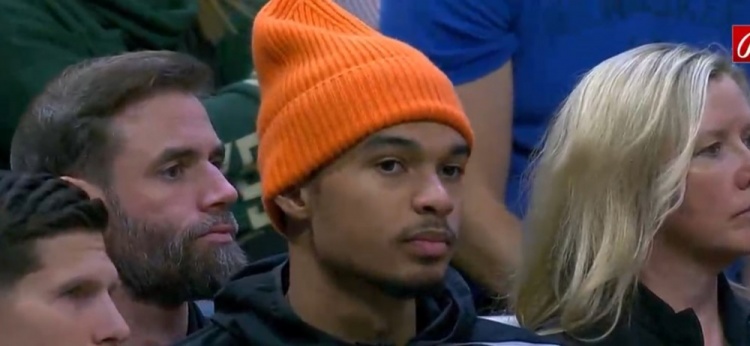 文班亚马因右脚踝酸痛缺席本场,但他随队来到密尔沃基,头顶小橙帽在场边为队友们加油助威。