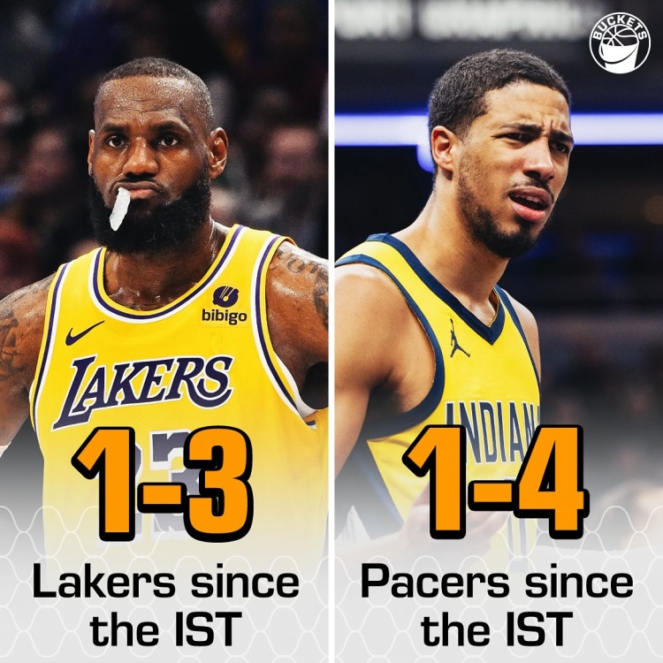 季中赛决赛后,湖人战绩为1胜3负,而步行者在季中赛决赛后仅取得了1胜4负的战绩,期间步行者与湖人分别只战胜过东西部排名垫底的活塞和马刺。