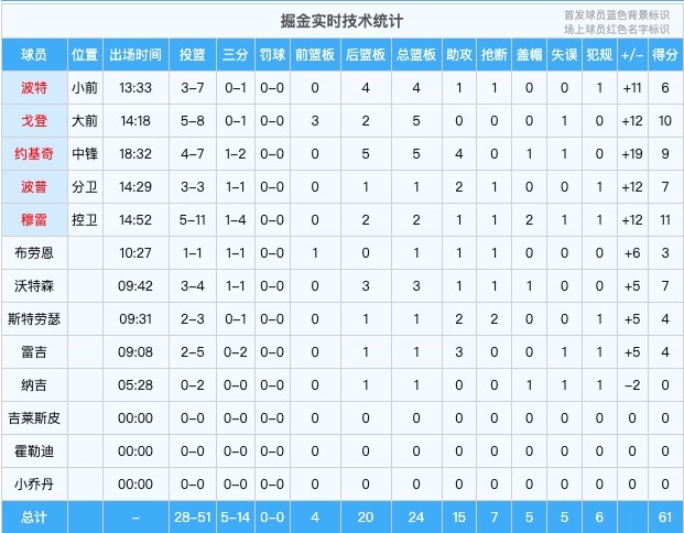 掘金半场61-44领先猛龙17分!约基奇拿下9分5板4助&穆雷11分