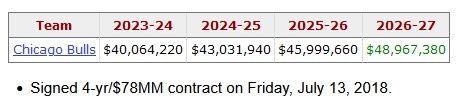 “从公牛队的角度来看,最大的障碍就是拉文的要价,或者是德罗赞、卡鲁索的。拉文将是他们首选交易对象,他有一份巨额合同,公牛队在拉文的带领下,在过去的七个赛季中一直陷入停滞状态。他目前正处在一份五年2.15亿美元的合同的第二个赛季,对大多数球队来说将很难吸收,并且这预计将限制公牛队的可交易报价。”