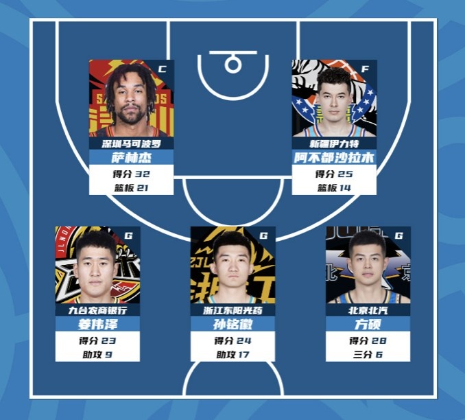 2023-2024赛季CBA联赛常规赛第19轮结束较量,来自深圳新世纪烈豹篮球俱乐部的萨林杰、新疆广汇篮球俱乐部的阿不都沙拉木、吉林东北虎男篮的姜伟泽、浙江广厦篮球俱乐部的孙铭徽、北京首钢篮球俱乐部的方硕入选CBA联赛常规赛第19轮最佳阵容!