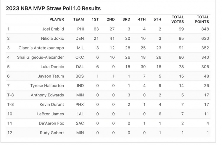 ESPN专家组MVP投票:恩比德约基奇字母哥前三 KD第八老詹第十