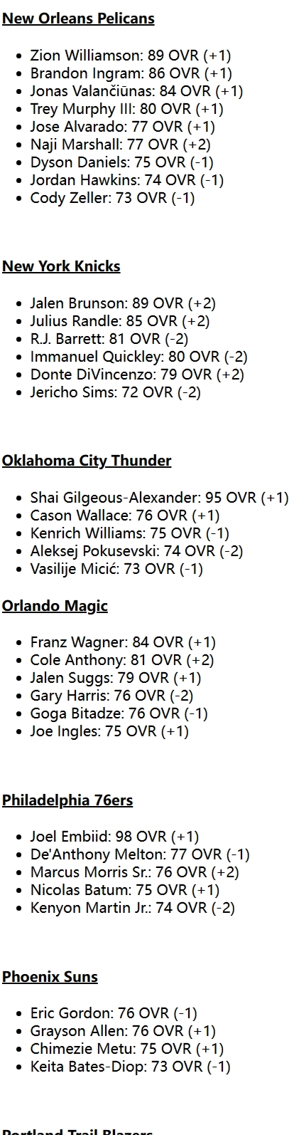 重点球员方面,恩比德98(+1)、字母哥97(+1)、东契奇96(+1)、哈利伯顿94(+2)、浓眉93(+1)、科比-怀特81(+4)、狄龙80(+1)、艾克萨姆78(+4)、莱昂纳德91(+1)、亚历山大95(+1)、文班亚马86(+1)。