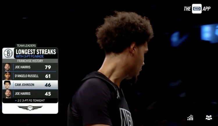 首节比赛篮网球员卡梅隆-约翰逊命中三分,至此他连续46场比赛至少命中一记三分,超越乔-哈里斯的45场,排名队史第3位。