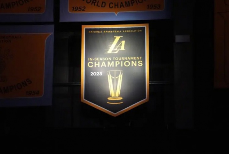 主持人说道:“湖人的总冠军旗都是黄色和紫色的,而季中锦标赛的则是黑色和金色的。”