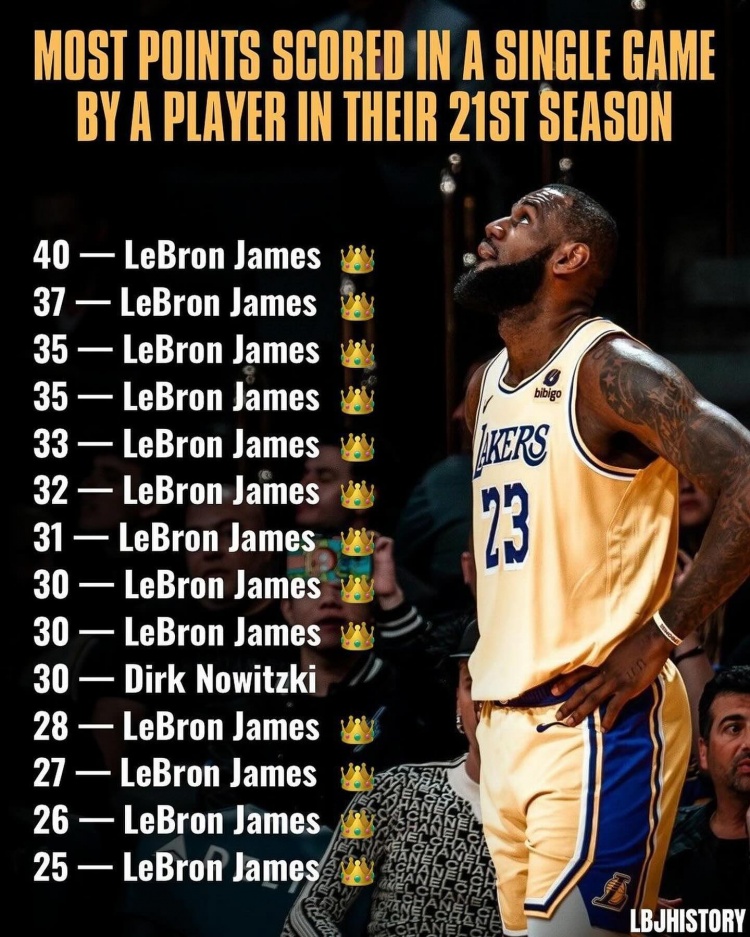 詹姆斯今日在INS转发了NBA球员生涯第21赛季单场得分排名,前14位仅德克占据了一席。