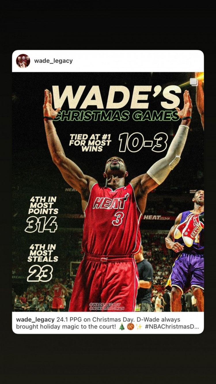 韦德转发自己圣诞大战数据:胜场数10场与老詹并列历史第一!