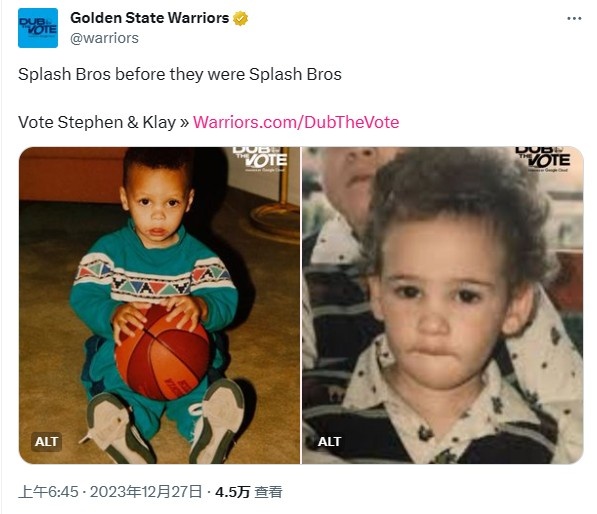 勇士官推写道:“水花兄弟成为水花兄弟之前的样子,请为他们投全明星票!”