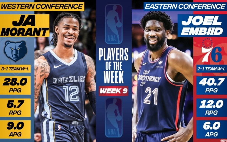 12月27日讯 NBA官方今日宣布了上周东西部最佳球员得主,灰熊球星莫兰特与76人球星恩比德分别当选。