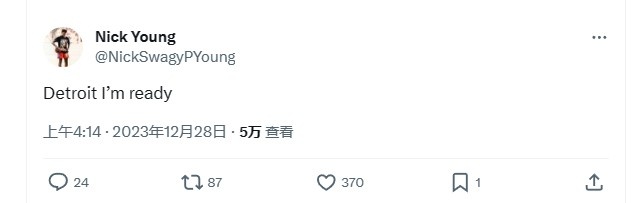 前NBA球员尼克-杨今日发推主动请缨,他写道:“底特律!我准备好了!”