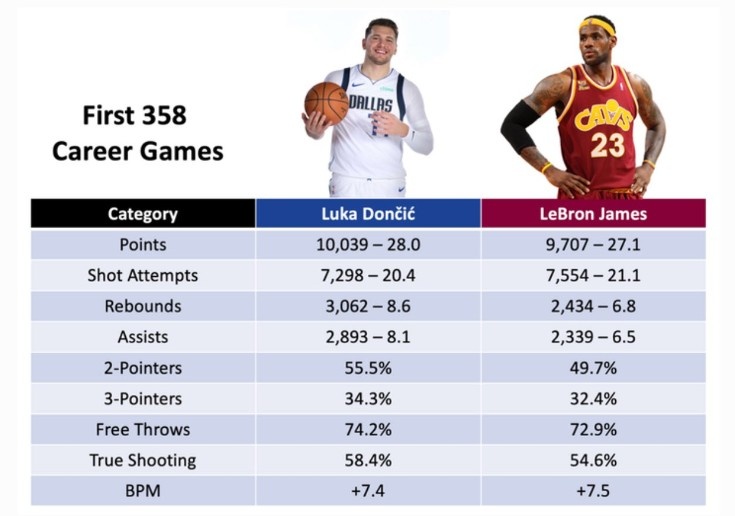 美媒对比东契奇&詹姆斯生涯前358场数据:东契奇多项占优