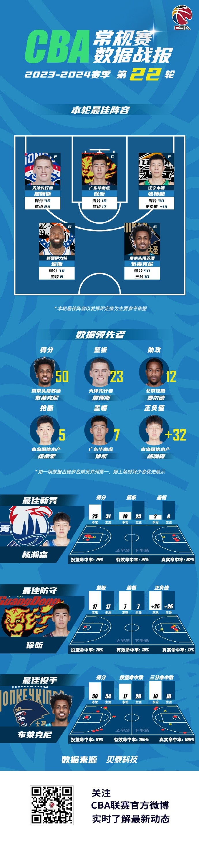 数据领先者方面:南京头排苏酒球员布莱克尼以单场50分的数据蝉联得分榜;