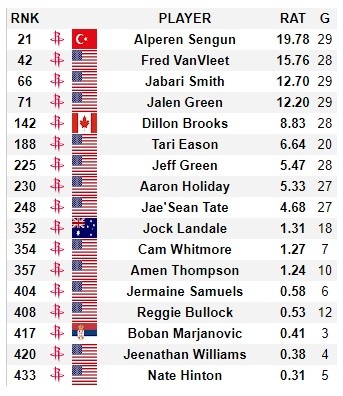 12月29日讯 美媒HoopsHype今日晒出火箭全队赛季至今的RAT值,申京遥遥领先,并在全联盟排名第21,范弗里特、小史密斯、杰伦-格林、狄龙分列队内2-5位。HoopsHyp