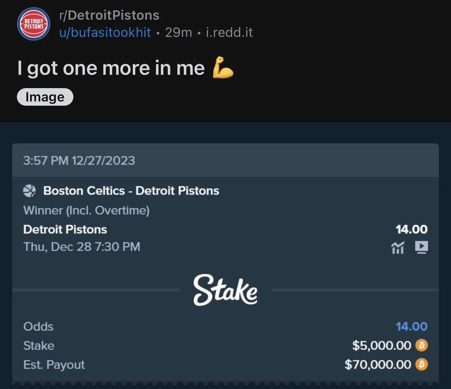12月29日讯 一位名叫bufasitookhit的活塞球迷晒照,表示他买了五千块今天活塞赢凯尔特人,赔率是14,万一活塞今天真赢了,他可以拿回7万美金!