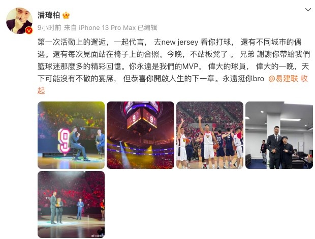 易建联好友、著名歌手潘玮柏也是到场出席。仪式结束之后他更新社媒晒照写道:“第一次活动上的邂逅,一起代言,去new jersey(新泽西)看你打球,还有不同城市的偶遇。还有每次见面站在椅子上的合照。今晚,不站板凳了。兄弟 谢谢你带给我们篮球迷那么多的精彩回忆。你永远是我们的MVP。伟大的球员,伟大的一晚,天下可能没有不散的宴席,但恭喜你开启人生的下一章。永远挺你bro”